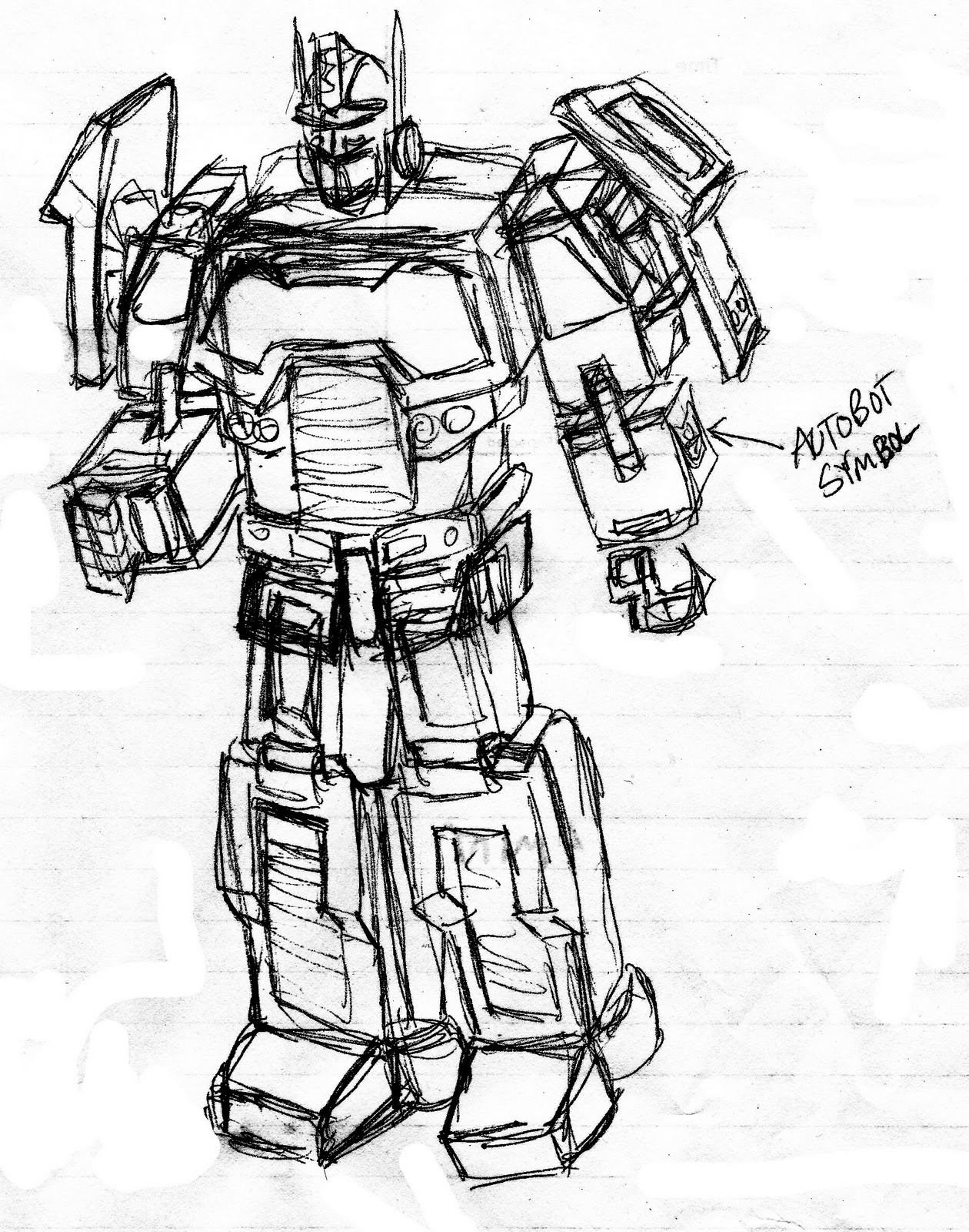 Two computers ago, I was working on a model of Optimus Prime. He had an original transformation that was like a reversed Powermaster Prime. Here's how far I got before I was forced to quit on him. In general, I had a very basic idea of his transformation and added stuff on to it as I went along. Nothing was really planned out, as you can tell by the overly-long arms, his super thin thighs, and his awkward waist/hips. Still, I'm happy with how the design works out, and with some tweaking, I think it'll make for a good design. Since the computer wasn't available to me, I turned to pen and paper for a fix. I started out by raising up, and inverting the elbow joint. Originally, the forearm rotated 180 degrees over two joints, but that's what made them so long. By raising it up, I keep it to just a 90 degree rotation, and by having the elbow joint in the middle and not the sides, I can add an elbow pad to hide the joint.